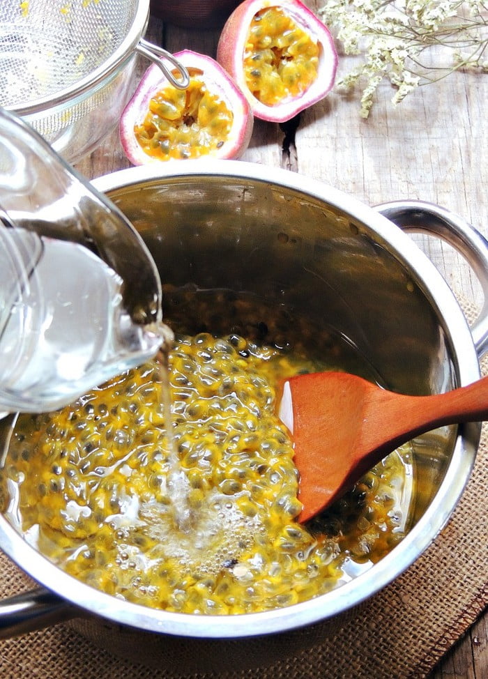 – Chanh dây rửa sạch, cắt làm đôi và lấy muỗng nạo hết ruột chanh. Lọc phần ruột này bằng rây để giữ lại nước cốt chanh. Kế đến, hòa thêm 100ml nước với nước cốt chanh dây.