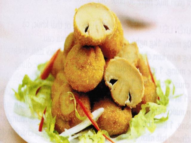 -Cách thực hiện: Nấm làm sạch, để cho ráo nước, nhúng đều vào bột chiên giòn. Sau đó lăn qua bột chiên xù. Cho vào chảo dầu chiên khoảng 5 – 7 phút. Sau đó vớt nấm ra, đặt trên giấy thấm dầu để hút bớt lượng mỡ. Pha nước tương trộn cùng sốt Mayonnaise.